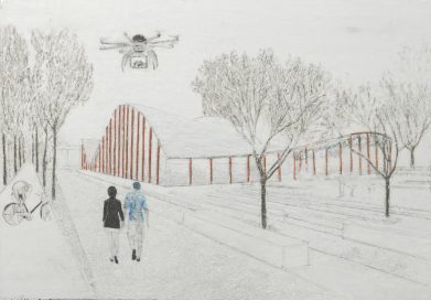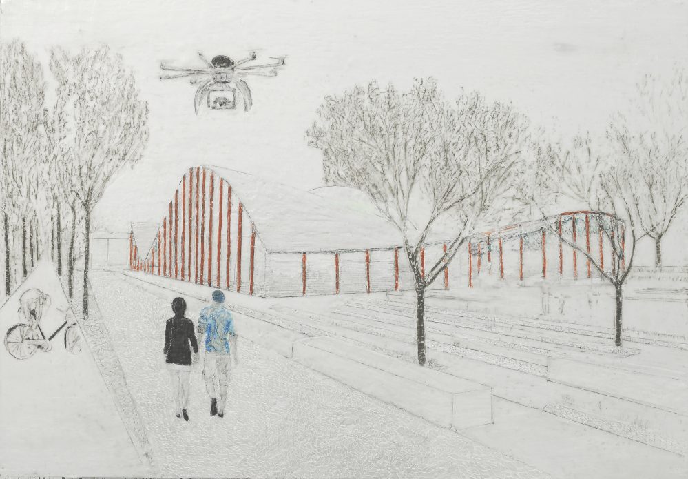 Drohne, Paraffin und Acryl auf Pappe, 70 x 100 cm