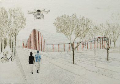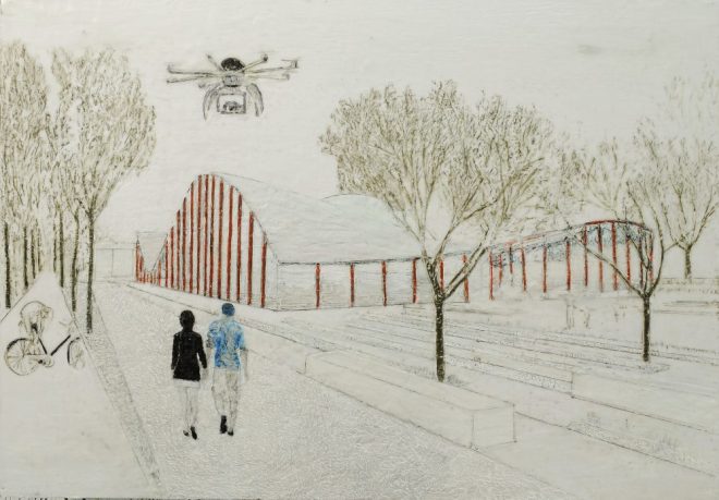 Drohne, Paraffin und Acryl auf Pappe, 70 x 100 cm