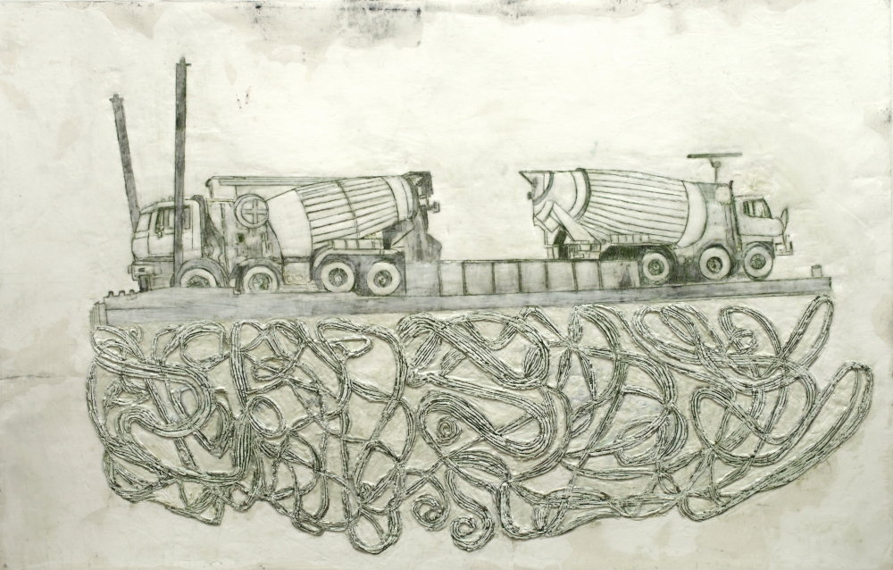 Previous ImageNext Image Ich bin 2 Betonmischer Ich bin 2 Betonmischer, Paraffin und Acryl auf Papier, 90 x 133 cm