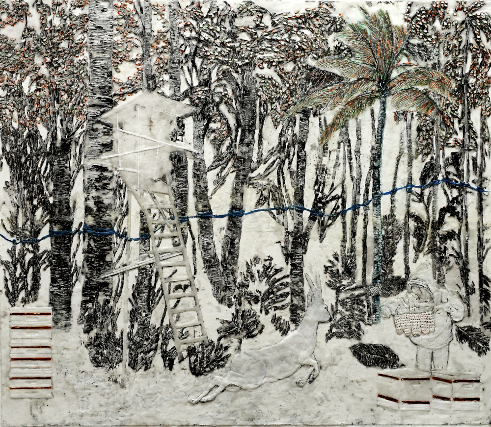 Imker im Wald, Paraffin und Acryl auf Papier, 95 x 110 cm