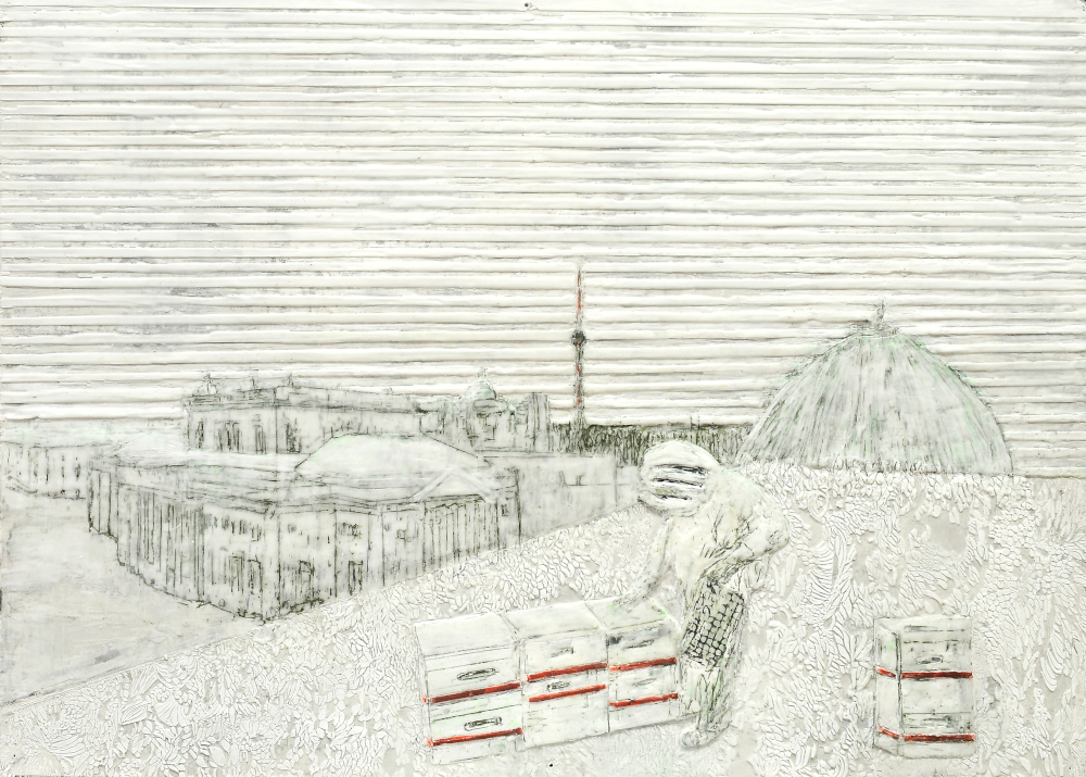 Previous ImageNext Image Über den Dächern 2 Über den Dächern 2, Paraffin und Acryl auf Pappe, 50 x 70 cm