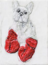 Previous ImageNext Image Hund_Boxhandschuhe Hund mit Boxhandschuhen, Paraffin und Öl auf Nessel, 24,5 x 18 cm