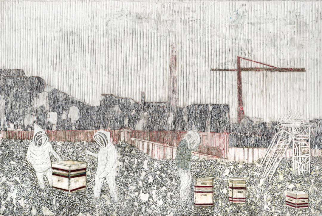 Über den Dächern 1, Paraffin und Acryl auf Papier, 101 x 152 cm